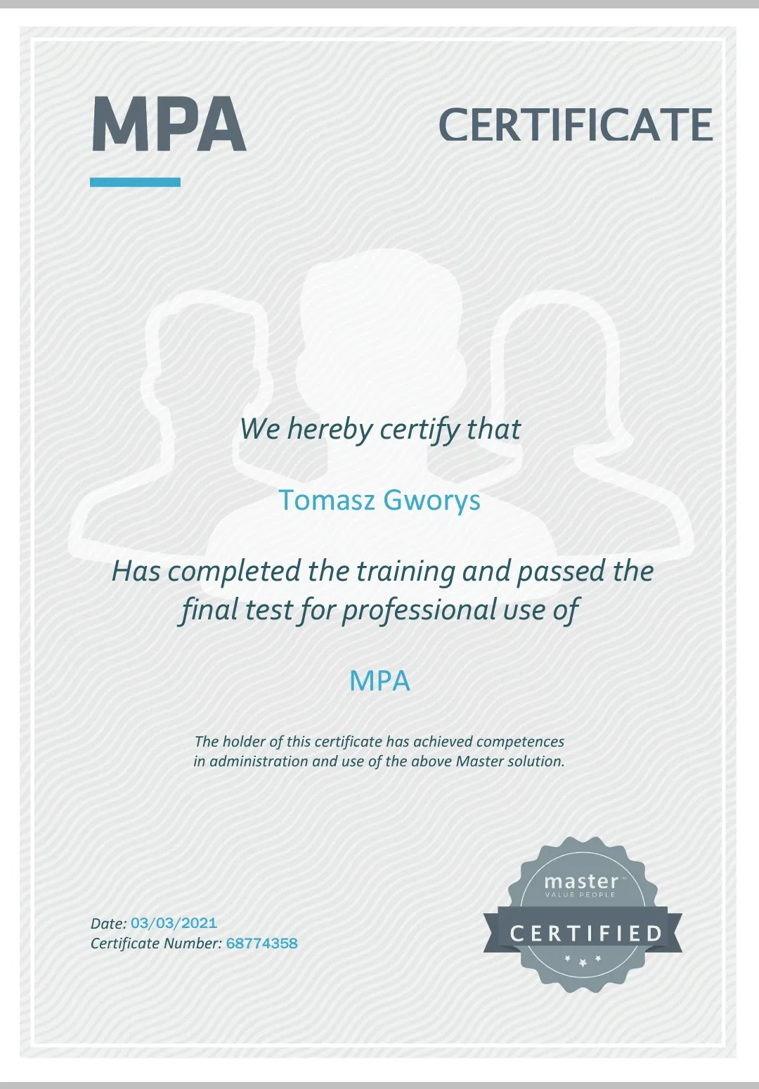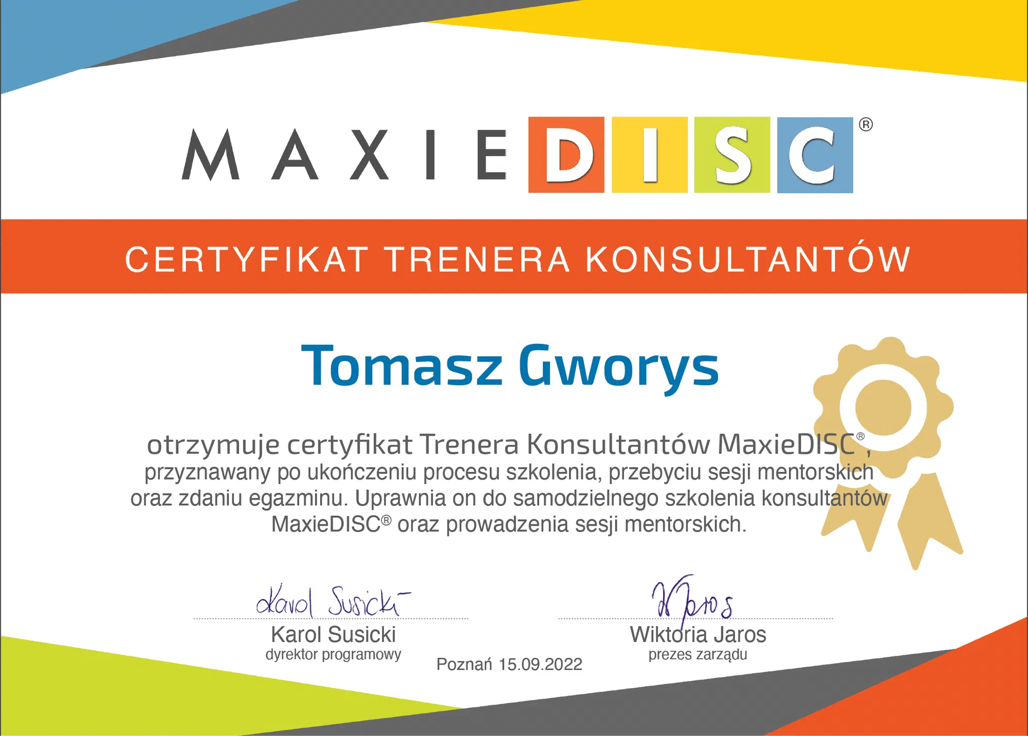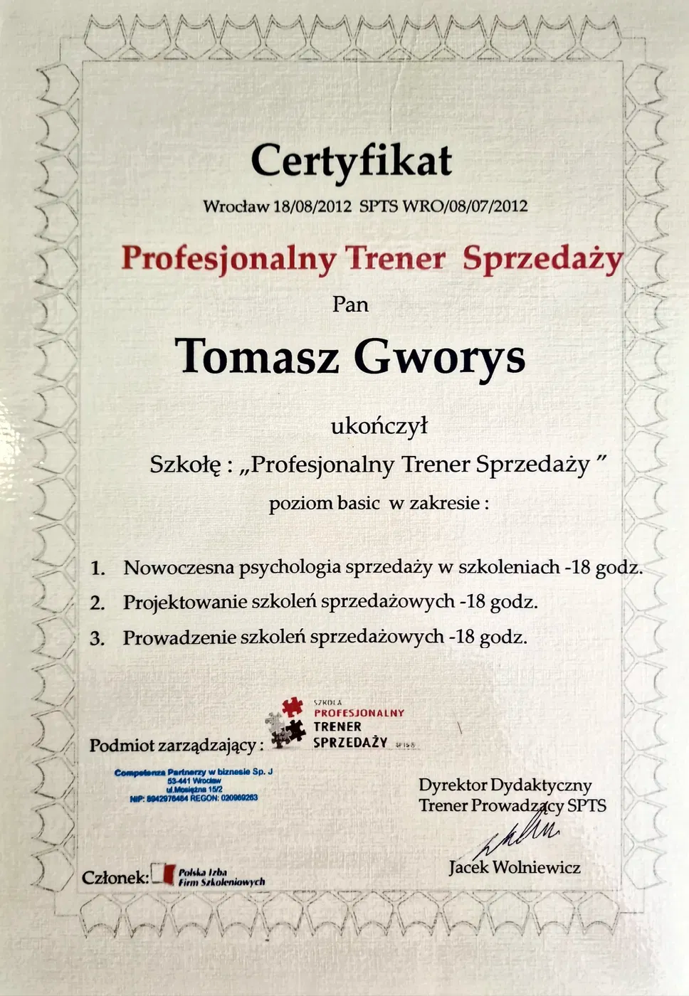 Ekspert MPA (Master Person Analysis) oraz BRIGHT. Trener z międzynarodowym certyfikatem: Master Class Business Trainer Brian Tracy International. Certyfikowany trener i facylitator Everthing DiSC® oraz konsultant, mentor i trener MaxieDISC®. Absolwent kierunku Psychologa Biznesu w Wyższej Szkole Zarządzania i Psychologii w Poznaniu. Dyrektor Operacyjny marki Kinetic Progress.